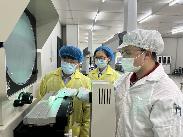 農(nóng)行寧波前灣新區(qū)支行客戶(hù)經(jīng)理在寧波云德半導(dǎo)體材料有限公司車(chē)間了解企業(yè)生產(chǎn)情況。資料照片