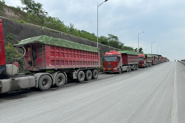 連接烏揚(yáng)公用碼頭的公路上,裝滿碎石的大貨車一眼望不到頭。一位司機(jī)告訴記者,原來卸貨裝船根本不用排隊(duì),現(xiàn)在排七八個(gè)小時(shí)是常態(tài)。