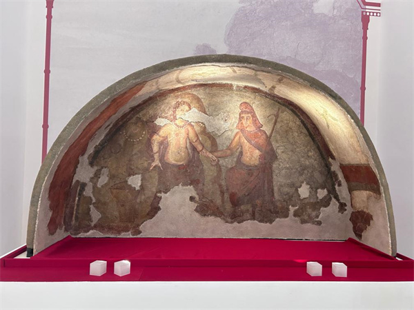 ??這是“描繪珀耳修斯和安德羅墨達(dá)的彩繪石膏壁畫(huà)”(真品)(6月13日攝)。新華社記者 張玉潔 攝