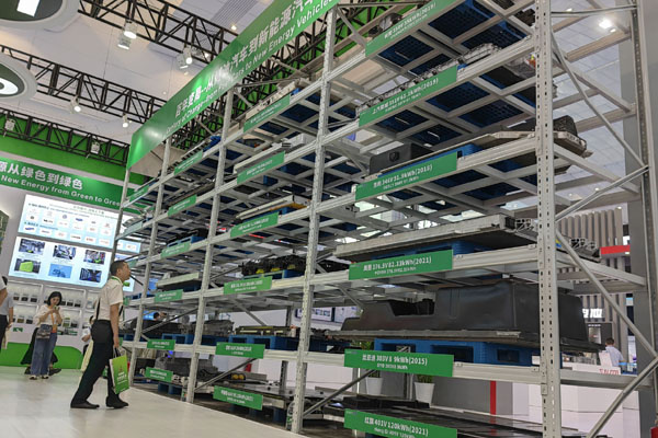 一家企業(yè)展示的回收的新能源汽車動(dòng)力電池。資料照片