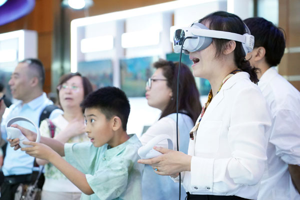 7月2日至5日,以“開啟數(shù)智新時代,共享數(shù)字新未來”為主題的2024全球數(shù)字經(jīng)濟(jì)大會在北京國家會議中心舉辦。圖為7月2日,觀眾在2024全球數(shù)字經(jīng)濟(jì)大會數(shù)字經(jīng)濟(jì)沉浸式體驗區(qū)體驗一款VR設(shè)備。新華社記者 任超 攝