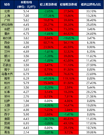 分價(jià)格區(qū)間來(lái)看,本期超市食用鹽銷售單價(jià)在5元/斤以上的城市有8個(gè),分別是北京、上海、廣州、烏魯木齊、南京、杭州、西寧、昆明;超市食用鹽銷售單價(jià)在4-5元/斤之間的城市有9個(gè),分別是呼和浩特、重慶、南昌、蘭州、天津、長(zhǎng)春、長(zhǎng)沙、貴陽(yáng)、濟(jì)南;超市食用鹽銷售單價(jià)在3-4元/斤之間的城市有6個(gè),分別是哈爾濱、西安、銀川、石家莊、南寧、武漢;超市食用鹽銷售單價(jià)在3元/斤以下的城市有5個(gè),分別是合肥、鄭州、拉薩、太原、青島。