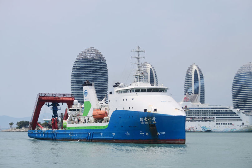 ??“探索一號”科考船搭載“奮斗者”號全海深載人潛水器返回海南三亞(2024年3月28日攝)。此次科考?xì)v時50天,順利完成中國-印度尼西亞爪哇海溝聯(lián)合深潛任務(wù)。新華社發(fā)(沙曉峰 攝)
