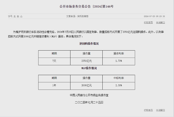 業(yè)內(nèi)人士表示,此次增開MLF操作滿足了金融機構(gòu)的中長期資金需求。本次加場MLF操作臨近月末,金融機構(gòu)流動性需求明顯增加,貨幣市場利率有一定上行壓力,7月24日銀行間隔夜和7天回購利率都在1.75%附近,較央行7月22日降息當(dāng)天高9個和4個基點。