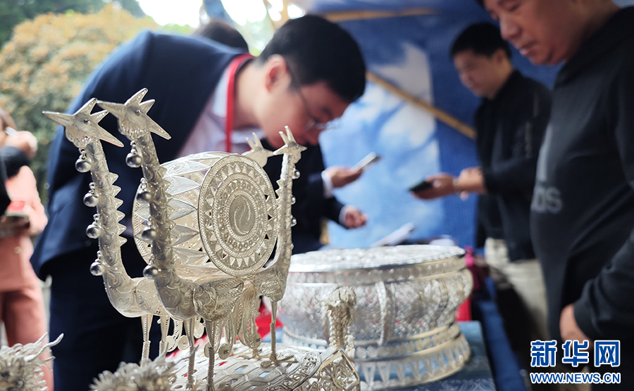 10月11日,參加茅臺酒節(jié)的嘉賓在茅臺中國酒文化城參觀苗族銀飾。新華網(wǎng) 盧志佳 攝