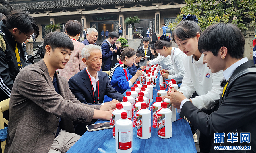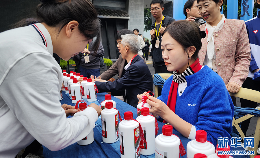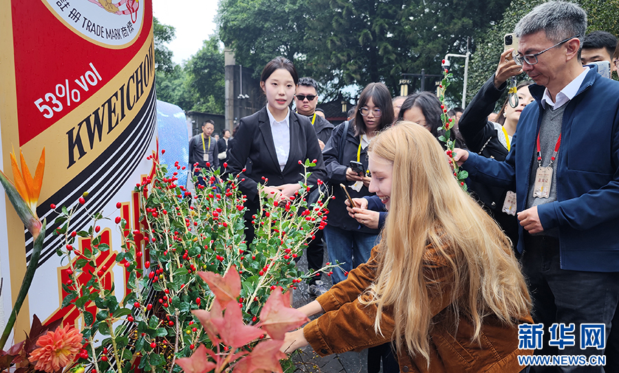 10月11日,參加茅臺酒節(jié)的嘉賓在茅臺中國酒文化城體驗茅臺栓絲帶。新華網(wǎng) 盧志佳 攝