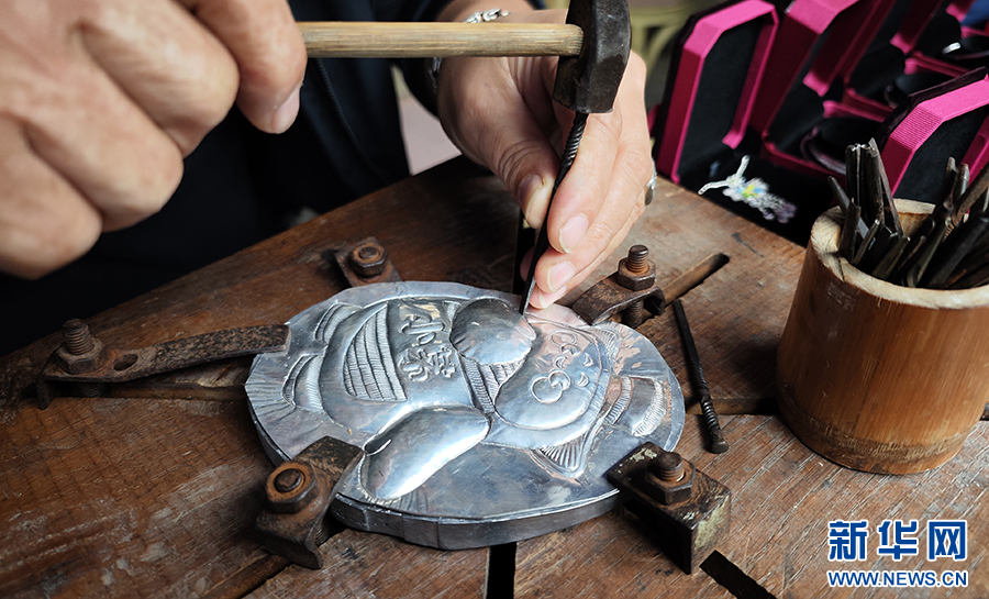 10月11日,貴州苗族銀飾非遺傳承人在茅臺酒節(jié)用銀鍛造茅臺“小茅”形象。新華網(wǎng) 盧志佳 攝