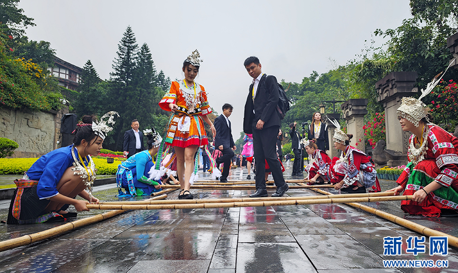 10月11日,參加茅臺酒節(jié)的嘉賓在茅臺中國酒文化城體驗竹竿舞。新華網(wǎng) 盧志佳 攝