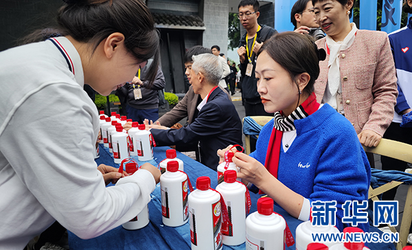10月11日,參加茅臺(tái)酒節(jié)的嘉賓在茅臺(tái)中國(guó)酒文化城體驗(yàn)茅臺(tái)栓絲帶。新華網(wǎng) 盧志佳 攝