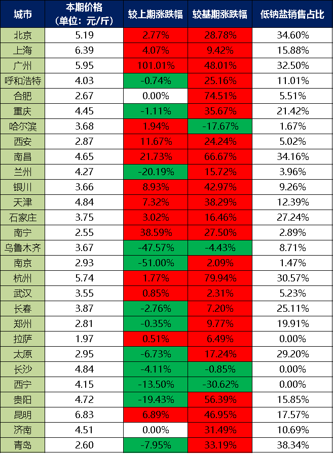 分價(jià)格區(qū)間來(lái)看,本期超市食用鹽銷售單價(jià)在5元/斤以上的城市有5個(gè),分別是北京、上海、廣州、杭州、昆明;超市食用鹽銷售單價(jià)在4-5元/斤之間的城市有9個(gè),分別是呼和浩特、重慶、南昌、蘭州、天津、長(zhǎng)沙、西寧、貴陽(yáng)、濟(jì)南;超市食用鹽銷售單價(jià)在3-4元/斤之間的城市有6個(gè),分別是哈爾濱、銀川、石家莊、烏魯木齊、武漢、長(zhǎng)春;超市食用鹽銷售單價(jià)在3元/斤以下的城市有8個(gè),分別是合肥、西安、南寧、南京、鄭州、拉薩、太原、青島。