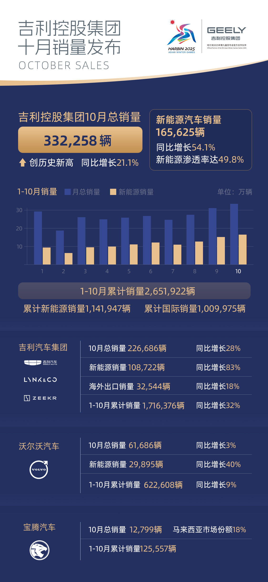 吉利新能源銷量165,625輛,同比增長54.1%,新能源滲透率49.8%;1-10月累計銷量2,651,922輛,同比增長21.1%,累計新能源銷量1,141,947輛,同比增長50.7%;累計國際銷量1,009,975輛,同比增長22.7%。
