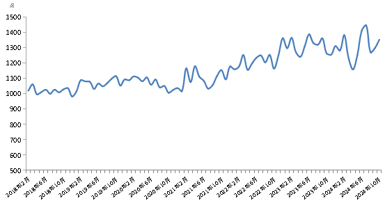 10月份,新華·中鹽食用鹽(商超)價格指數(shù)報1352.74點,較上期(2024年9月)上漲54.74點,漲幅4.22%;較基期(2018年1月)上漲352.74點,漲幅35.27%;較周期內(nèi)最高點1445.75點(2024年7月)下跌93.01點,跌幅6.59%;較周期內(nèi)最低點981.91點(2018年12月)上漲370.83點,漲幅37.77%。