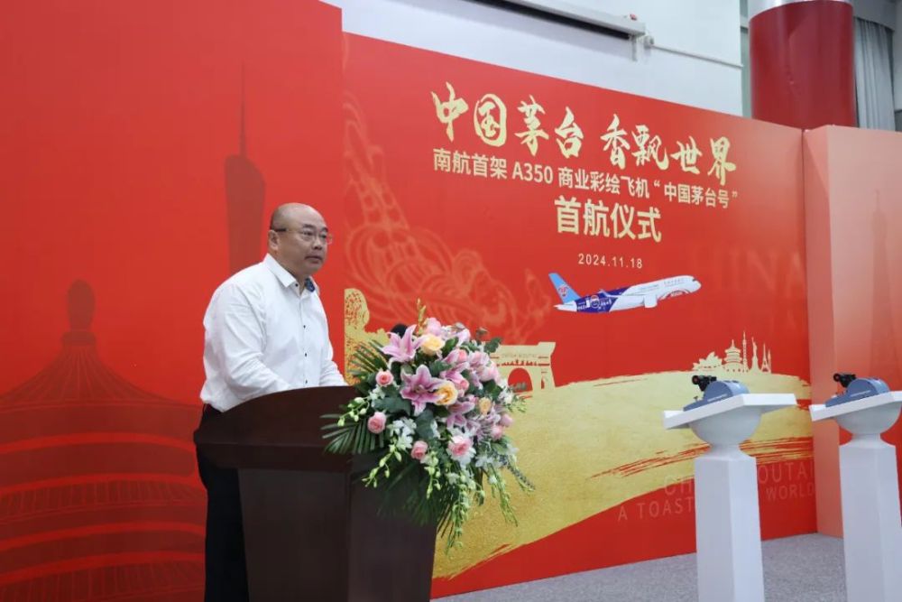 吳榕新在致辭中表示,南航與茅臺(tái)的合作不僅是兩個(gè)企業(yè)間的強(qiáng)強(qiáng)聯(lián)合,更是央企與地方國資企業(yè)合作的典范,這種合作不僅是資源的整合,更是優(yōu)勢(shì)的互補(bǔ),對(duì)于促進(jìn)區(qū)域經(jīng)濟(jì)的高質(zhì)量發(fā)展具有重要意義。在西部振興的戰(zhàn)略背景下,央企與地方國資企業(yè)的合作尤為重要,此次“中國茅臺(tái)號(hào)”彩繪客機(jī)A350的啟航,正是央地合作、央企為西部振興助力的具體體現(xiàn),不僅為茅臺(tái)品牌增添了一張靚麗的“空中名片”,也為南航集團(tuán)的機(jī)隊(duì)增添了一抹獨(dú)特的色彩。未來,希望雙方繼續(xù)攜手,發(fā)揮各自優(yōu)勢(shì),進(jìn)一步整合資源,共同做強(qiáng)做優(yōu)做大,將“中國茅臺(tái)號(hào)”彩繪客機(jī)A350打造成為連接茅臺(tái)文化與世界各地的橋梁,讓更多旅客在飛行中感受中國品牌的獨(dú)特魅力與時(shí)代活力。