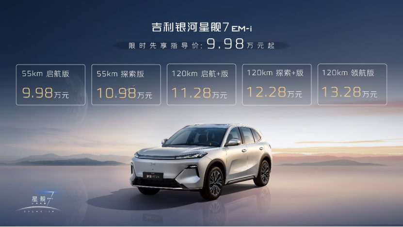 12月6日,吉利銀河全新A級電混SUV——“新一代國民精品SUV”吉利銀河星艦7EM-i(簡稱吉利銀河星艦7)在吉利汽車夢想啟航的地方——浙江臺州正式上市。新車共推出五個(gè)版型,分別是120km領(lǐng)航版、120km探索+版、120km啟航+版、55km探索版、55km啟航版,限時(shí)先享指導(dǎo)價(jià)為9.98萬元—13.28萬元。即日起,用戶可通過吉利銀河APP、微信小程序、抖音小程序及官網(wǎng)等官方渠道下訂,下訂用戶可享限時(shí)免費(fèi)享價(jià)值8800元的Flyme Sound無界之聲、限時(shí)免費(fèi)享價(jià)值1200-3000元配置、限時(shí)享8萬24期0息、不限品牌的4000元置換補(bǔ)貼等豐厚購車權(quán)益。