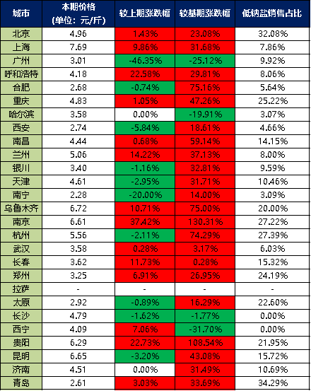 分城市來看,截至2024年11月,北京、上海、呼和浩特、重慶、南昌、蘭州、烏魯木齊、南京、武漢、長春、鄭州、西寧、貴陽、青島超市銷售食用鹽均價較2024年10月上漲;哈爾濱、濟南超市銷售食用鹽均價較2024年10月持平;廣州、合肥、西安、銀川、天津、南寧、杭州、太原、長沙、昆明超市銷售食用鹽均價較2024年10月下跌。