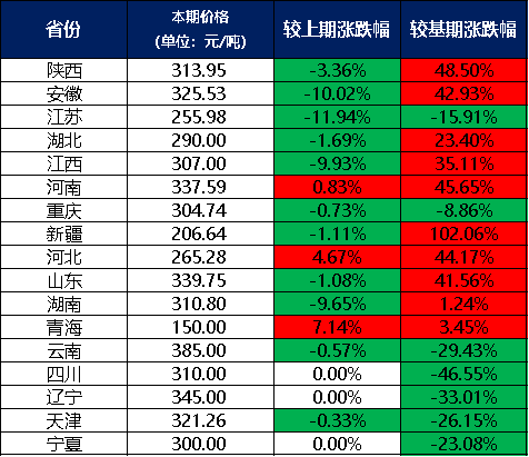 分價(jià)格區(qū)間來(lái)看,本期兩堿工業(yè)鹽單價(jià)在300元/噸及以上的地區(qū)有12個(gè),分別是陜西、安徽、江西、河南、重慶、山東、湖南、云南、四川、遼寧、天津、寧夏;兩堿工業(yè)鹽單價(jià)在300元/噸以下的地區(qū)有5個(gè),分別是江蘇、湖北、新疆、河北、青海。