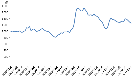 2025年1月份,新華·中鹽兩堿工業(yè)鹽價(jià)格指數(shù)報(bào)1259.08點(diǎn),較上期(2024年12月)下跌32.42點(diǎn),跌幅2.51%;較基期(2018年1月)上漲259.08點(diǎn),漲幅25.91%;較周期內(nèi)最高點(diǎn)1736.66點(diǎn)(2022年4月)下跌477.58點(diǎn),跌幅27.50%;較周期內(nèi)最低點(diǎn)816.2點(diǎn)(2020年8月)上漲442.88點(diǎn),漲幅54.26%。