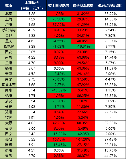 分價格區(qū)間來看,本期超市食用鹽銷售單價在5元/斤以上的城市有7個,分別是北京、上海、廣州、烏魯木齊、杭州、貴陽、昆明;超市食用鹽銷售單價在4-5元/斤之間的城市有9個,分別是呼和浩特、重慶、南昌、蘭州、天津、長春、太原、長沙、濟(jì)南;超市食用鹽銷售單價在3-4元/斤之間的城市有6個,分別是哈爾濱、銀川、南京、武漢、鄭州、西寧;超市食用鹽銷售單價在3元/斤以下的城市有5個,分別是合肥、西安、南寧、拉薩、青島。