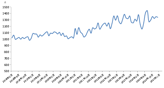 2025年1月份,新華·中鹽食用鹽(商超)價格指數(shù)報1340.82點,較上期(2024年12月)下跌9.06點,跌幅0.67%;較基期(2018年1月)上漲340.82點,漲幅34.08%;較周期內(nèi)最高點1445.75點(2024年7月)下跌104.93點,跌幅7.43%;較周期內(nèi)最低點981.91點(2018年12月)上漲358.91點,漲幅36.55%。