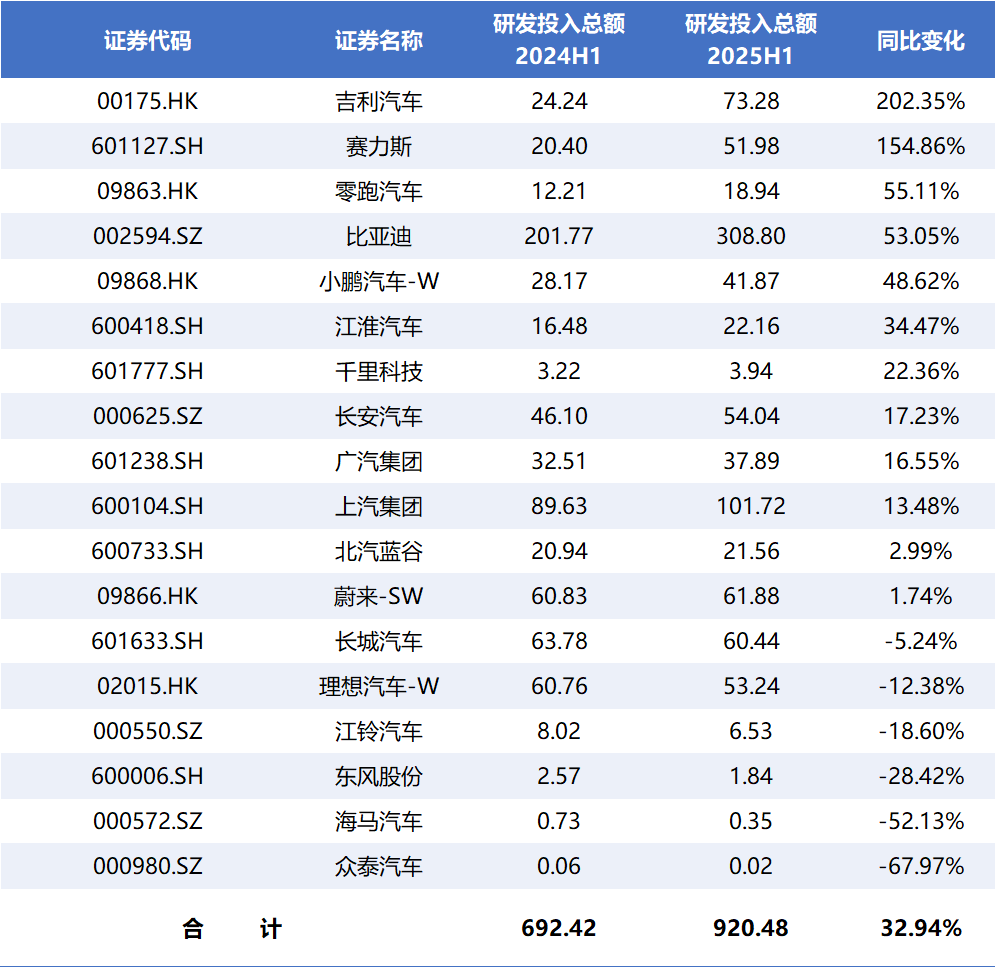 在乘用車市場競爭激烈之際,上市車企正試圖在盈利水平與研發(fā)投入之間找到平衡點(diǎn)。同花順iFinD數(shù)據(jù)顯示,截至9月2日,已披露的18家上市車企(A股+H股)今年上半年研發(fā)投入(費(fèi)用化研發(fā)支出+資本化研發(fā)支出)合計920.48億元,同比增長32.94%。受車企盈利能力等因素影響,車企研發(fā)投入強(qiáng)度出現(xiàn)分化,納入統(tǒng)計的18家車企中,12家車企的研發(fā)投入同比實現(xiàn)正增長,占比為66.67%,吉利汽車(00175.HK)、賽力斯(601127.SH)、零跑汽車(09863.HK)等公司研發(fā)投入同比增幅居前,而長城汽車(601633.SH)、理想汽車(02015.HK)等車企研發(fā)投入同比減少。