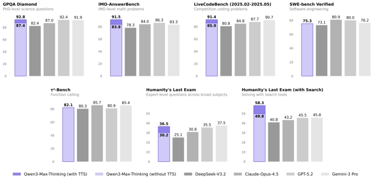 1月26日,阿里正式發(fā)布千問旗艦推理模型Qwen3-Max-Thinking,創(chuàng)下數(shù)項權(quán)威評測全球新紀(jì)錄,性能媲美GPT-5.2、Gemini 3 Pro,成為迄今為止最接近國際頂尖模型的國內(nèi)最強AI大模型。通過總參數(shù)、強化學(xué)習(xí)、推理計算的極致規(guī)模擴展,千問新模型實現(xiàn)了性能的大幅飛躍,刷新科學(xué)知識(GPQA Diamond)、數(shù)學(xué)推理(IMO-AnswerBench)、代碼編程(LiveCodeBench)等多項關(guān)鍵性能基準(zhǔn)測試的全球紀(jì)錄。
