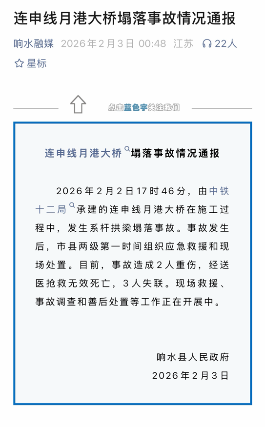 2月3日凌晨,江蘇省鹽城市響水縣人民政府通報稱,2026年2月2日17時46分,由中鐵十二局承建的連申線月港大橋在施工過程中,發(fā)生系桿拱梁塌落事故。事故發(fā)生后,市縣兩級第一時間組織應急救援和現(xiàn)場處置。目前,事故造成2人重傷,經送醫(yī)搶救無效死亡,3人失聯(lián)?,F(xiàn)場救援、事故調查和善后處置等工作正在開展中。