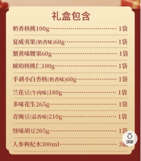 《經(jīng)濟(jì)參考報(bào)》記者瀏覽電商平臺(tái)發(fā)現(xiàn),該商品詳情頁顯示,禮盒包含核桃100g、夏威夷果60g、腰果60g、核桃仁100g、小白杏核60g等堅(jiān)果類產(chǎn)品,其余為蘭花豆、青豌豆、胡豆及飲品等非堅(jiān)果類產(chǎn)品。