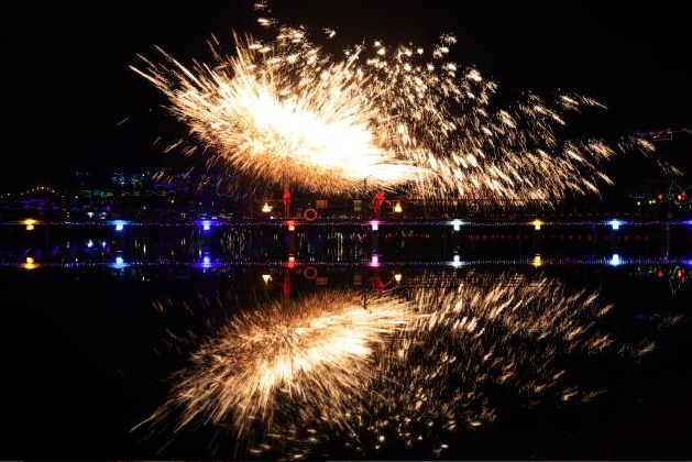 2026年2月19日,安徽省亳州市蒙城縣雙鎖山景區(qū),民間藝人在為游人進(jìn)行“打鐵花”表演。(胡衛(wèi)國(guó) 攝)