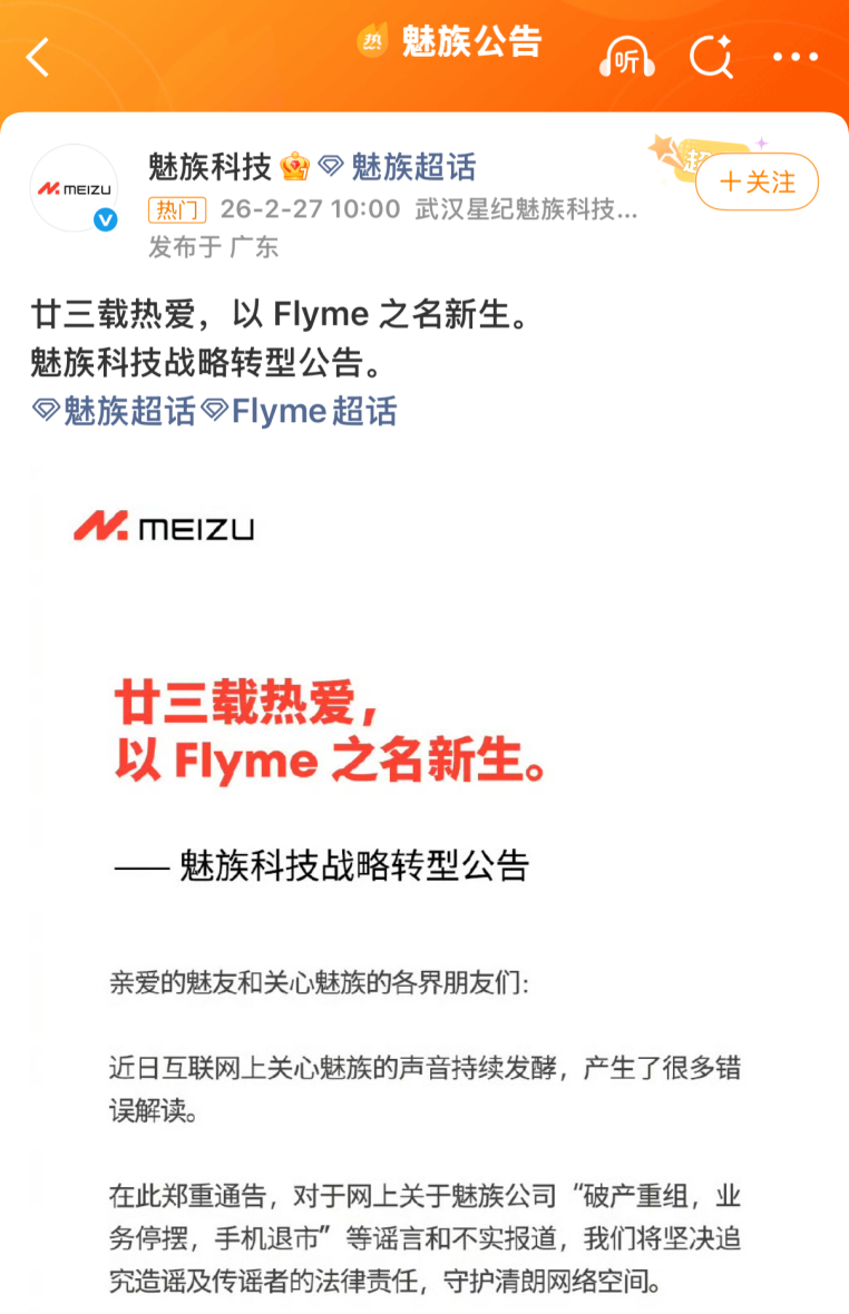 2月27日,魅族科技通過官方微博發(fā)布戰(zhàn)略轉(zhuǎn)型公告,針對近期網(wǎng)絡(luò)上流傳的“手機業(yè)務(wù)停擺、團隊解散、破產(chǎn)重組”等傳聞作出正式回應(yīng),同時宣布公司重大業(yè)務(wù)調(diào)整與戰(zhàn)略方向。