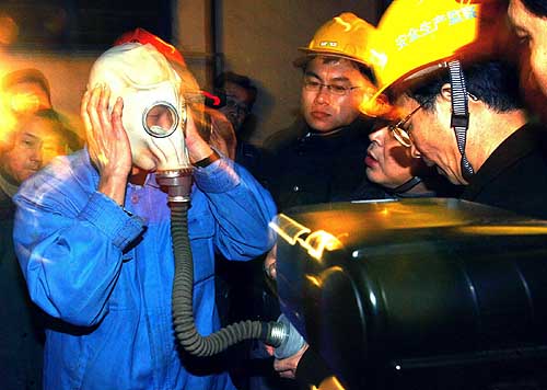 兩會期間發(fā)生的撫順礦業(yè)集團(tuán)老虎臺煤礦特大透水事故,使代表委員談起安全生產(chǎn)的話題顯得更加迫切。他們認(rèn)為搞好安全生產(chǎn)必須破除畸形的發(fā)展觀、政績觀。 圖為安監(jiān)人員在檢查上海市化工研究院員工對防毒面具的使用常識(資料照片)。