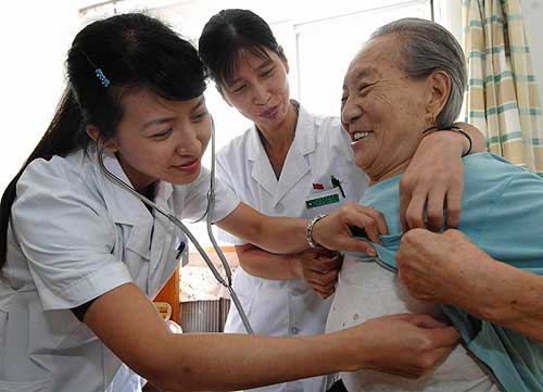 如何讓老百姓盡量少花錢(qián)看好?陳海嘯代表認(rèn)為,除提高醫(yī)務(wù)人員技術(shù)水平和從醫(yī)道德,規(guī)范醫(yī)院發(fā)展方向、促進(jìn)醫(yī)療體制改革,實(shí)行醫(yī)藥分家等措施外,還應(yīng)制定一個(gè)作為行醫(yī)治病標(biāo)準(zhǔn)的疾病診療指南。 圖為沈陽(yáng)市和平區(qū)新興社區(qū)衛(wèi)生服務(wù)中心大夫杜雪梅(左)和馬荏秋(中)在為夏春英老人檢查身體(資料照片)。