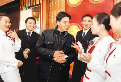 3月2日,農(nóng)民工全國(guó)人大代表、重慶城建集團(tuán)農(nóng)工班班長(zhǎng)康厚明(中)來(lái)到北京一家重慶餐館,征求重慶籍外來(lái)工的意見(jiàn)。會(huì)上,他將就農(nóng)民工醫(yī)療、工傷保險(xiǎn)等問(wèn)題提出相關(guān)建議。