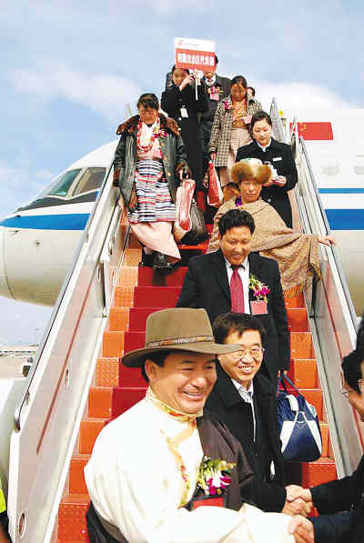 肩負(fù)著各族人民的重托,3月2日上午,西藏代表團(tuán)成員抵達(dá)北京,在首都國(guó)際機(jī)場(chǎng)受到熱烈歡迎。徐錦庚 攝 |