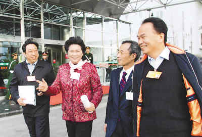 3月1日,全國(guó)人大代表文花枝(中)在長(zhǎng)沙火車(chē)站受到青年的歡迎。楊抒懷