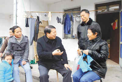 全國(guó)人大代表、浙江省奉化市滕頭村黨支部書(shū)記傅企平(中)在農(nóng)民家里調(diào)研。袁坤