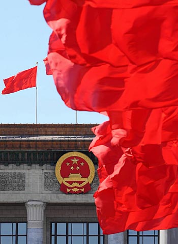 3月3日,北京人民大會(huì)堂前紅旗飄揚(yáng)。