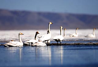 | 青海湖越冬大天鵝數(shù)量創(chuàng)歷史最高紀(jì)錄,這是在青海湖冰面上休息的大天鵝(2008年3月1日攝)。新華社記者 嘎瑪