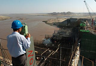 | 2007年10月22日,一名中國(guó)工人在蘇丹首都喀土穆以北的麥羅維大壩施工現(xiàn)場(chǎng)進(jìn)行測(cè)量。麥羅維大壩由中國(guó)水利電力對(duì)外公司和中國(guó)水利水電建設(shè)集團(tuán)公司承建,是迄今為止中國(guó)企業(yè)承包的最大國(guó)際工程,也是蘇丹乃至非洲目前在建的最大水電項(xiàng)目。新華社記者
