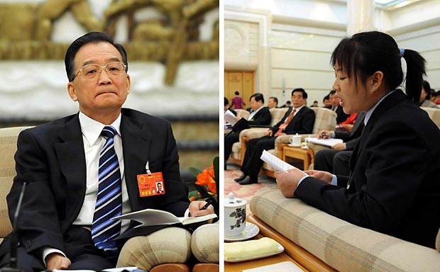 3月7日,中共中央政治局常委、國(guó)務(wù)院總理溫家寶參加十一屆全國(guó)人大一次會(huì)議廣東代表團(tuán)的審議。來(lái)自廣東佛山的農(nóng)民工代表胡小燕(右圖)發(fā)言時(shí)說(shuō):“農(nóng)民工最關(guān)心的事情就是擔(dān)心留在家鄉(xiāng)的孩子每天是不是吃飽了飯,穿暖了衣,上學(xué)的路上是不是安全……”,溫家寶總理聽(tīng)胡小燕發(fā)言時(shí)表情凝重(左圖)。聽(tīng)完胡小燕的發(fā)言,溫家寶總理說(shuō):“你關(guān)心的問(wèn)題,也是我關(guān)心的問(wèn)題!