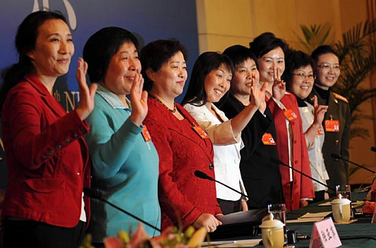 3月8日,在北京參加十一屆全國人大一次會議的8位女代表在北京兩會新聞中心接受記者集體采訪。