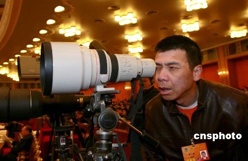 全國政協(xié)十一屆一次會議第二次全體會議在北京人民大會堂舉行。著名導演、北京電視藝術中心的馮小剛委員在大會堂借用攝影記者的長焦鏡頭細觀會場。