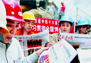 昨天(3月10日),承擔(dān)北京CBD地下通道工程建設(shè)的中鐵16局組織工人集體閱讀報(bào)紙,關(guān)注全國兩會(huì)。