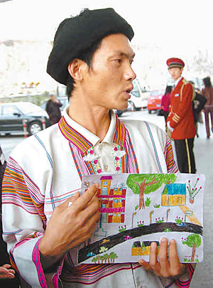 來自云南省西雙版納傣族自治州景洪市基諾山基諾族鄉(xiāng)巴卡完小教師包布魯代表正在展示學生的美術作品。他說,基諾族是我國政府最新確認的一個少數(shù)民族,是全國56個民族中最新的一朵花。