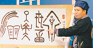 3月10日下午,水族代表、貴州省三都水族自治縣縣長張加春在展示水族書畫。水書是類似甲骨文和金文的一種古老的文字符號,被稱為象形文字的“活化石”。