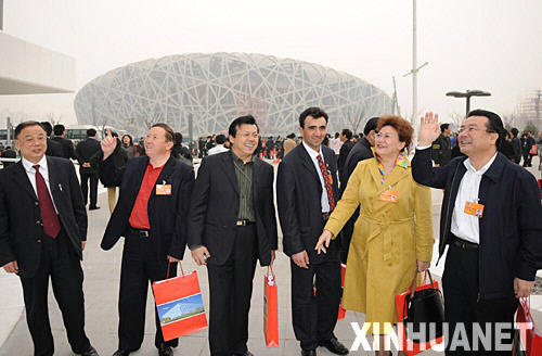 3月12日,出席全國政協(xié)十一屆一次會(huì)議的部分全國政協(xié)委員參觀北京奧運(yùn)場(chǎng)館。這是委員們?cè)趪殷w育場(chǎng)和國家游泳館外參觀。