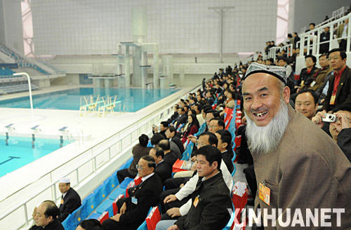 3月12日,出席全國政協(xié)十一屆一次會(huì)議的部分全國政協(xié)委員參觀北京奧運(yùn)場(chǎng)館。這是白克力·馬木提委員(前右,維吾爾族)在國家游泳館內(nèi)參觀。
