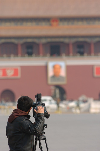 3月14日,中國人民政治協(xié)商會議第十一屆全國委員會第一次會議在北京人民大會堂舉行閉幕會。圖為當(dāng)日一名電視記者在廣場上拍攝外景。