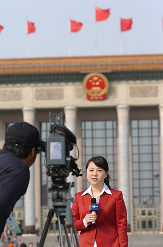 3月14日,中國人民政治協(xié)商會議第十一屆全國委員會第一次會議在北京人民大會堂舉行閉幕會。圖為當(dāng)日電視記者在廣場上做現(xiàn)場報(bào)道。