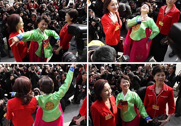 3月14日,中國人民政治協(xié)商會議第十一屆全國委員會第一次會議在北京人民大會堂閉幕。這是李承淑委員(朝鮮族)走出會場后面對眾多鏡頭欣然起舞。新華社記者 張燕輝 攝