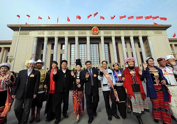 3月14日,中國人民政治協(xié)商會議第十一屆全國委員會第一次會議在北京人民大會堂閉幕。這是來自云南的委員在人民大會堂前合影。新華社記者 楊宗友 攝